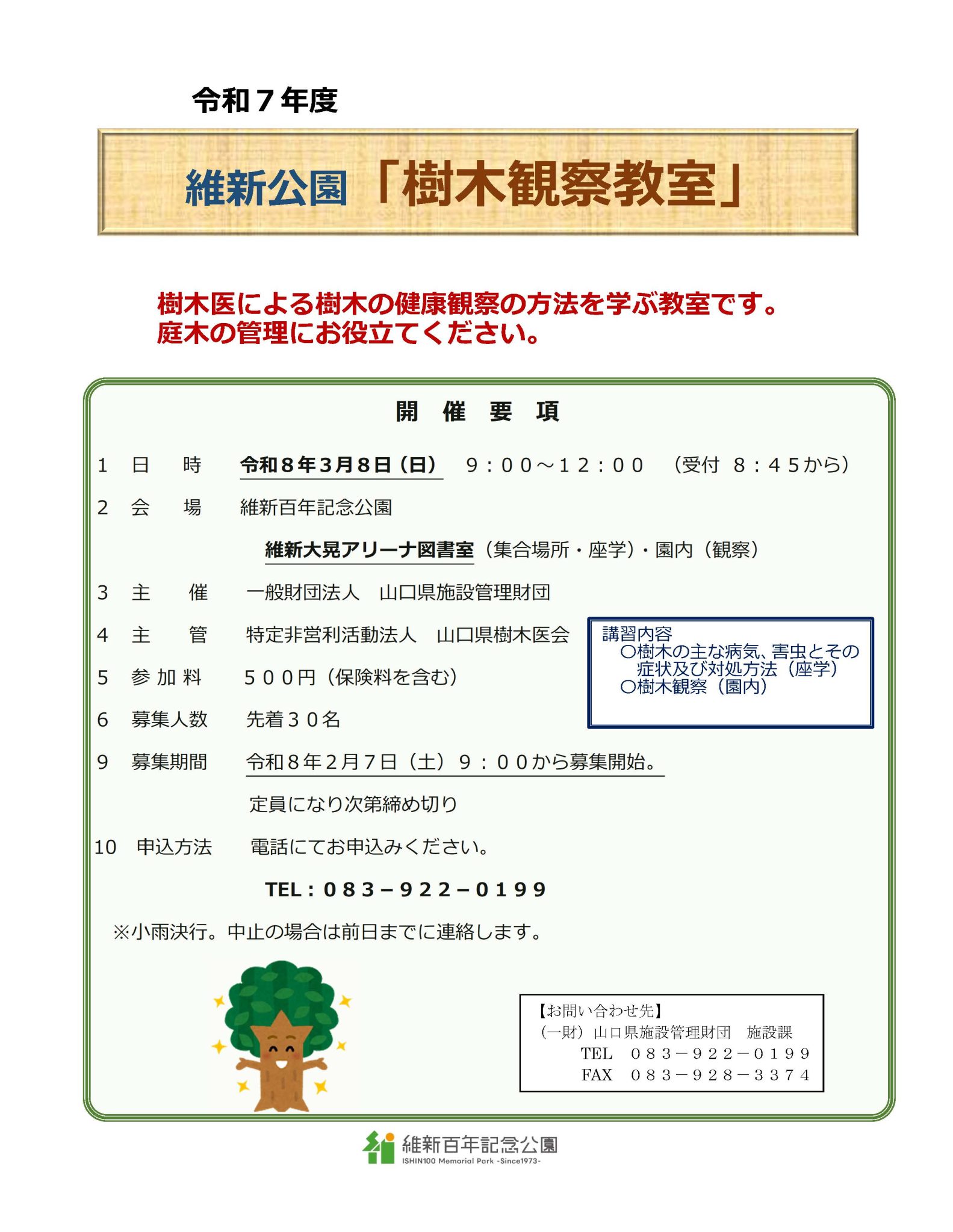 2026年2月2日 2026年2月3日 ishin_park 募集 「維新公園樹木観察教室」参加者募集 「維新公園樹木観察教室」を開催します。募集期間は、令和8年2月7日(土)午前9時から。電話にてお申し込みください。