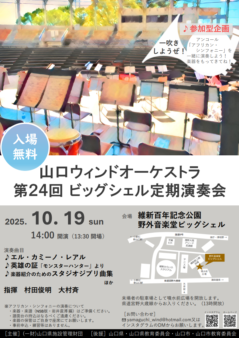 「ビッグシェル演奏会(山口ウィンドオーケストラ)」を開催しますので、みなさんのお越しをお待ちしています。