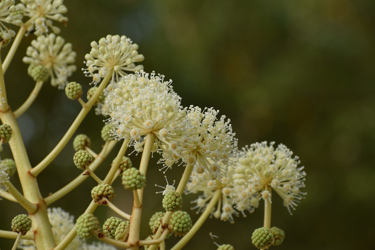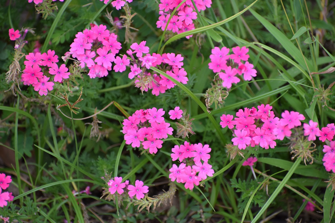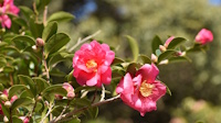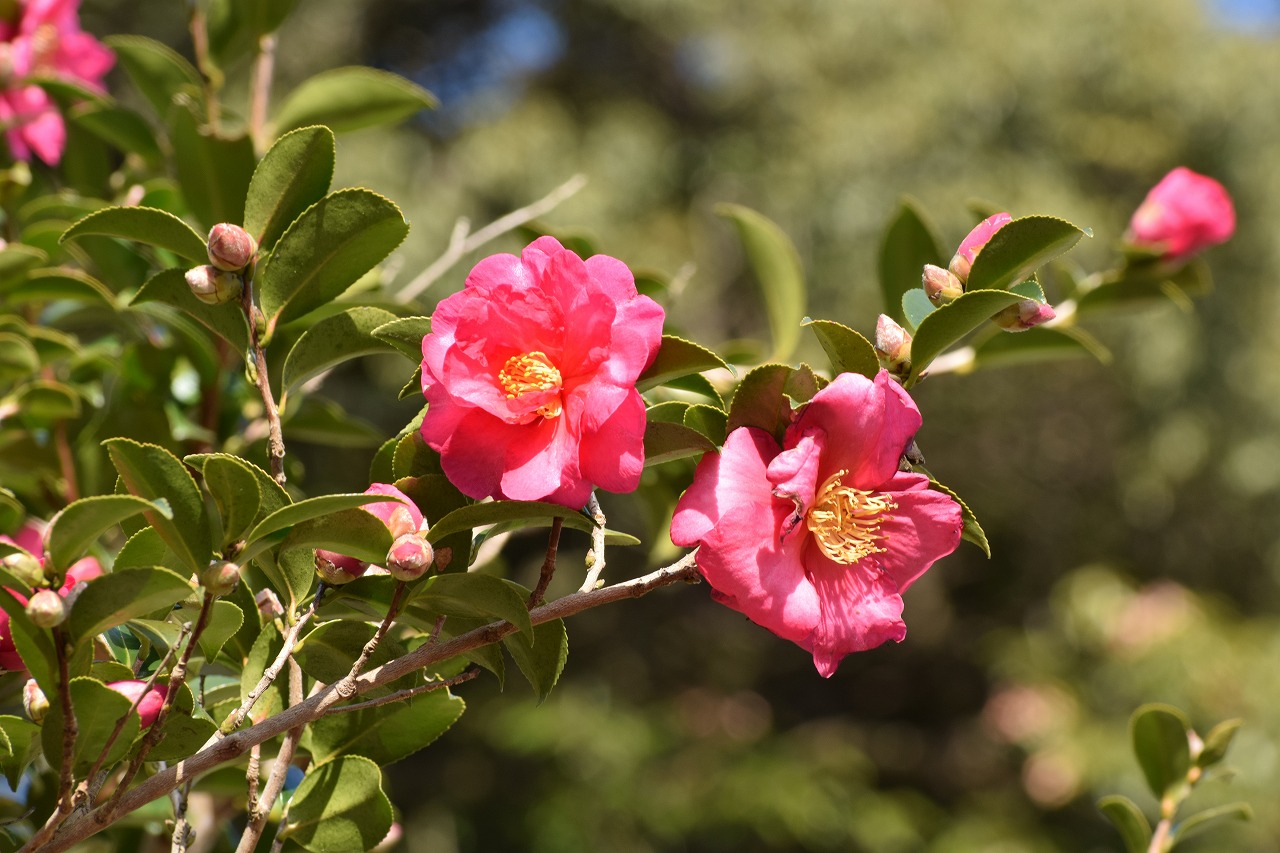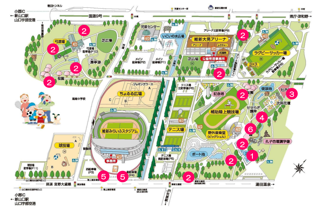 公園内では、1月にこんな花が咲きます。見に来てね!! ① バーベナ場所:三段池 ② サザンカ場所:弓道場北 ③ ハマヒサカキ場所:ボタン園東 ④ ヤツデ場所:沈床花壇南 ⑤ カンツバキ場所:維新みらいふスタジアム南 ⑥ 白梅場所:梅園 それぞれの花の番号は、公園内の場所を示しています。