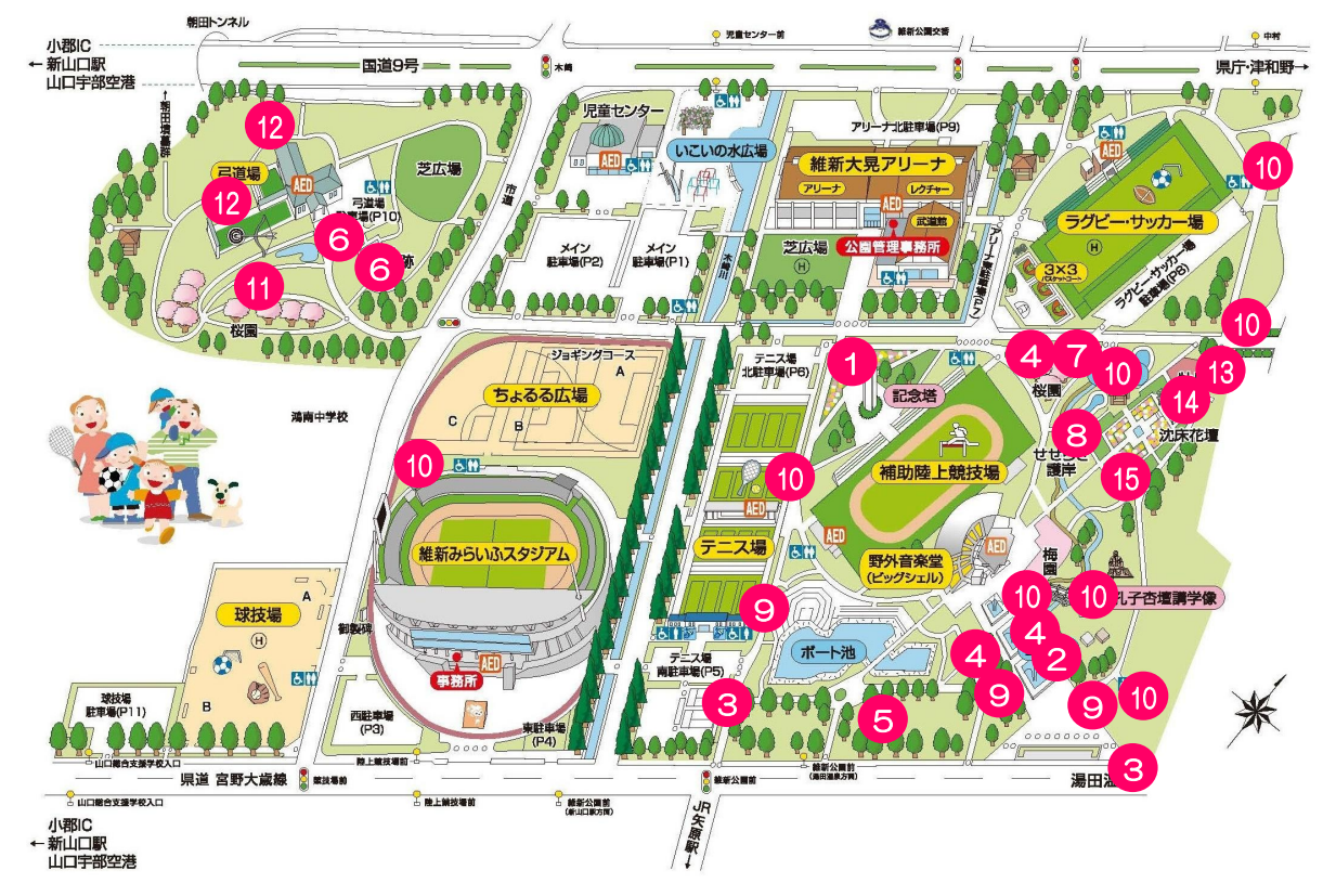 公園内では、11月にこんな花が咲きます。見に来てね!! ① ガザニア場所:記念塔 ② バーベナ場所:三段池 ③ アベリア場所:ちょるる広場西、テニス場壁打ち東 ④ キョウチクトウ場所:沈床花壇南、テニス場西、各所 ⑤ カンナ場所:ボート池 ⑥ シモツケ場所:弓道場 ⑦ ハギ場所:桜園北東 ⑧ お茶場所:徒渉池南 ⑨ ツワブキ場所:ボート池西、三段池西 ⑩ キンモクセイ場所:テニス場東、各所 ⑪ ムクゲ場所:ちょるる広場北 ⑫ サザンカ場所:弓道場北 ⑬ ハマヒサカキ場所:ボタン園東 ⑭ ヒイラギモクセイ場所:ボタン園北 ⑮ ヤツデ場所:沈床花壇南 それぞれの花の番号は、公園内の場所を示しています。