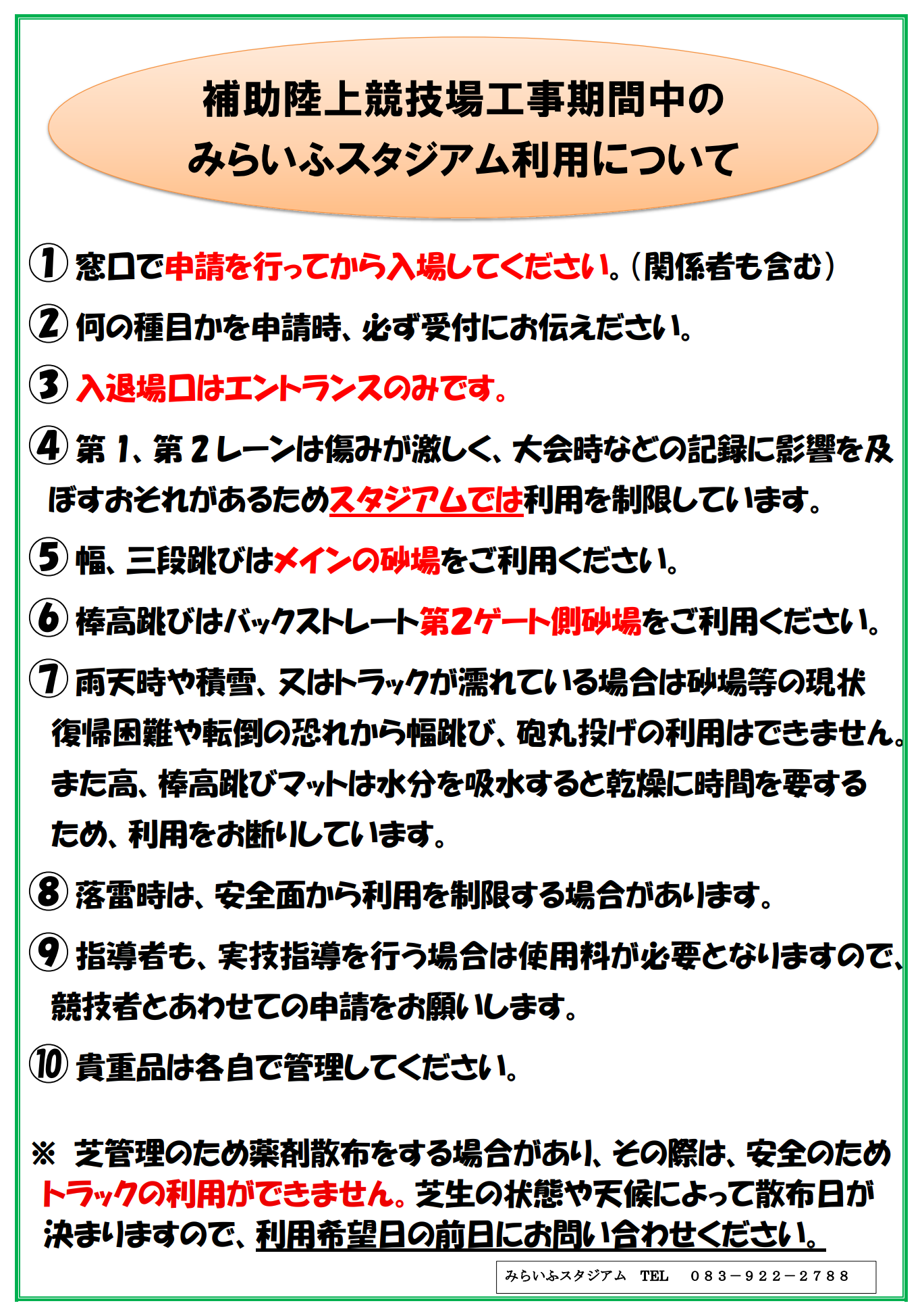 その間、陸上の個人利用については、大会使用のない時にみらいふスタジアム陸上競技場を使用できることとしますが、使用時間や使用のきまりが、補助陸上競技場とは異なっていますので、別紙をよくご確認ください。