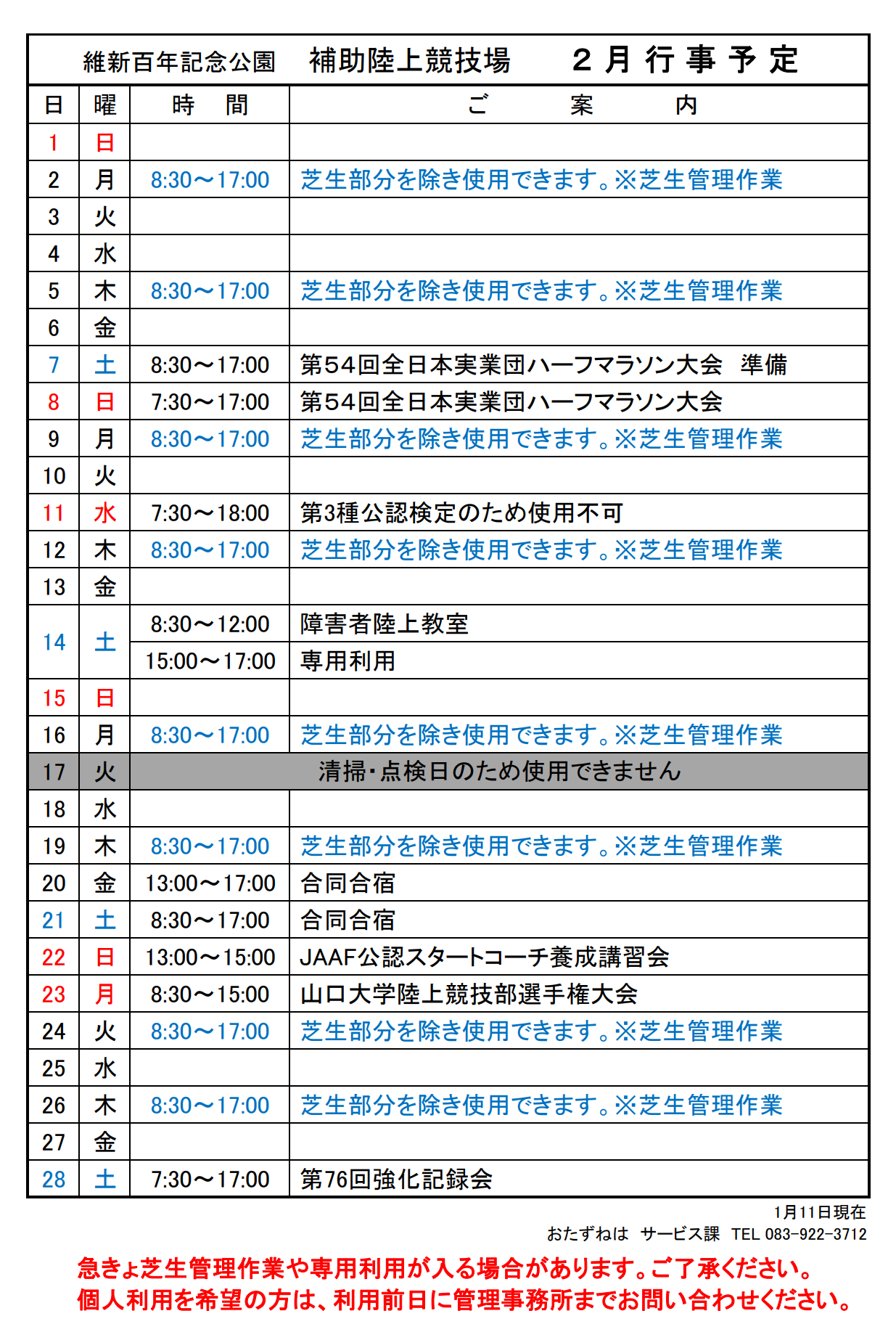 2026年1月13日 2026年1月13日 ishin_park お知らせ 補助陸上競技場・みらスタ個人使用利用予定について 大会行事等の専用利用が入っていない場合に、個人利用が可能となります。急きょ芝生管理作業や専用利用が入る場合があります。ご了承ください。個人利用をご希望の方は、利用前日に管理事務所までお問い合わせください。