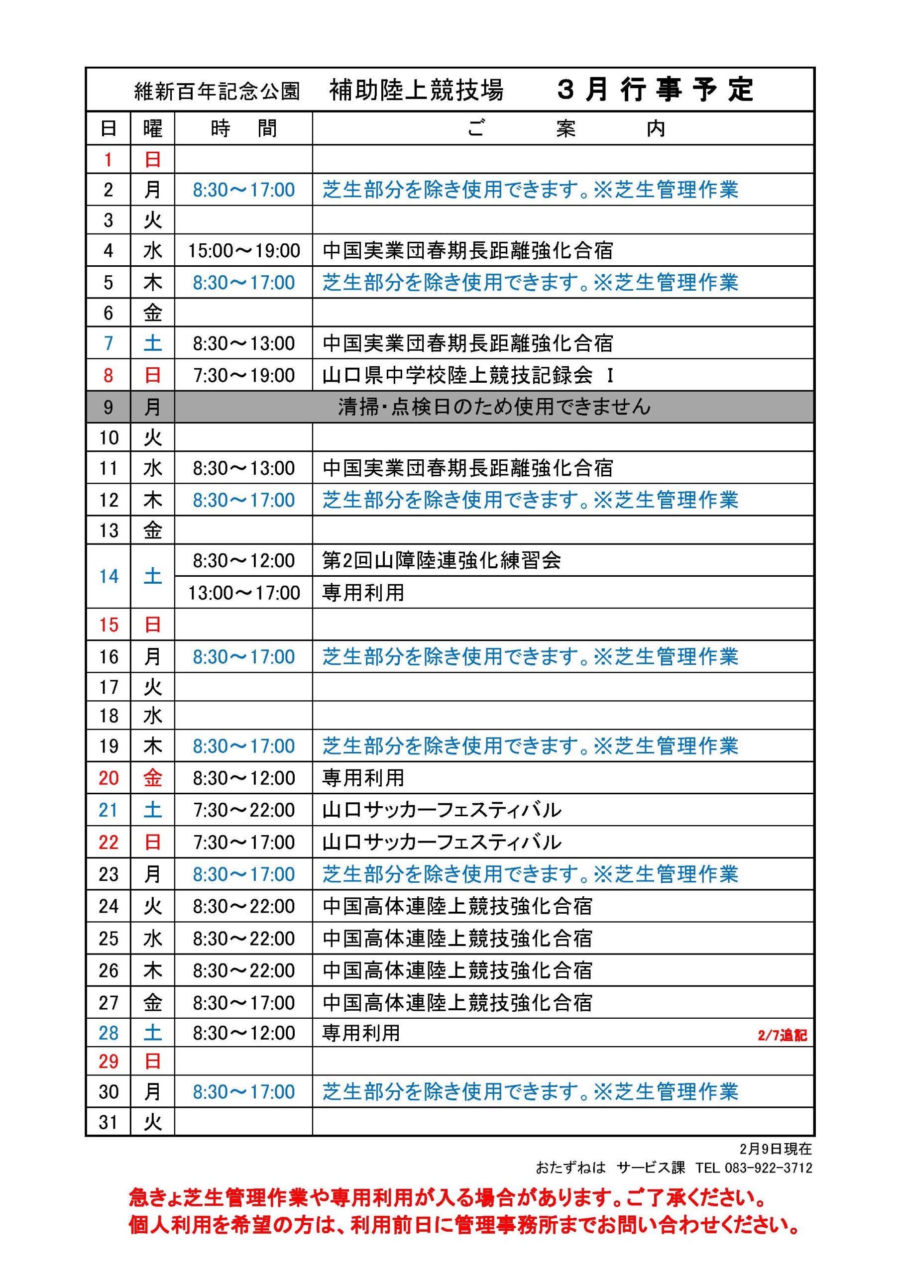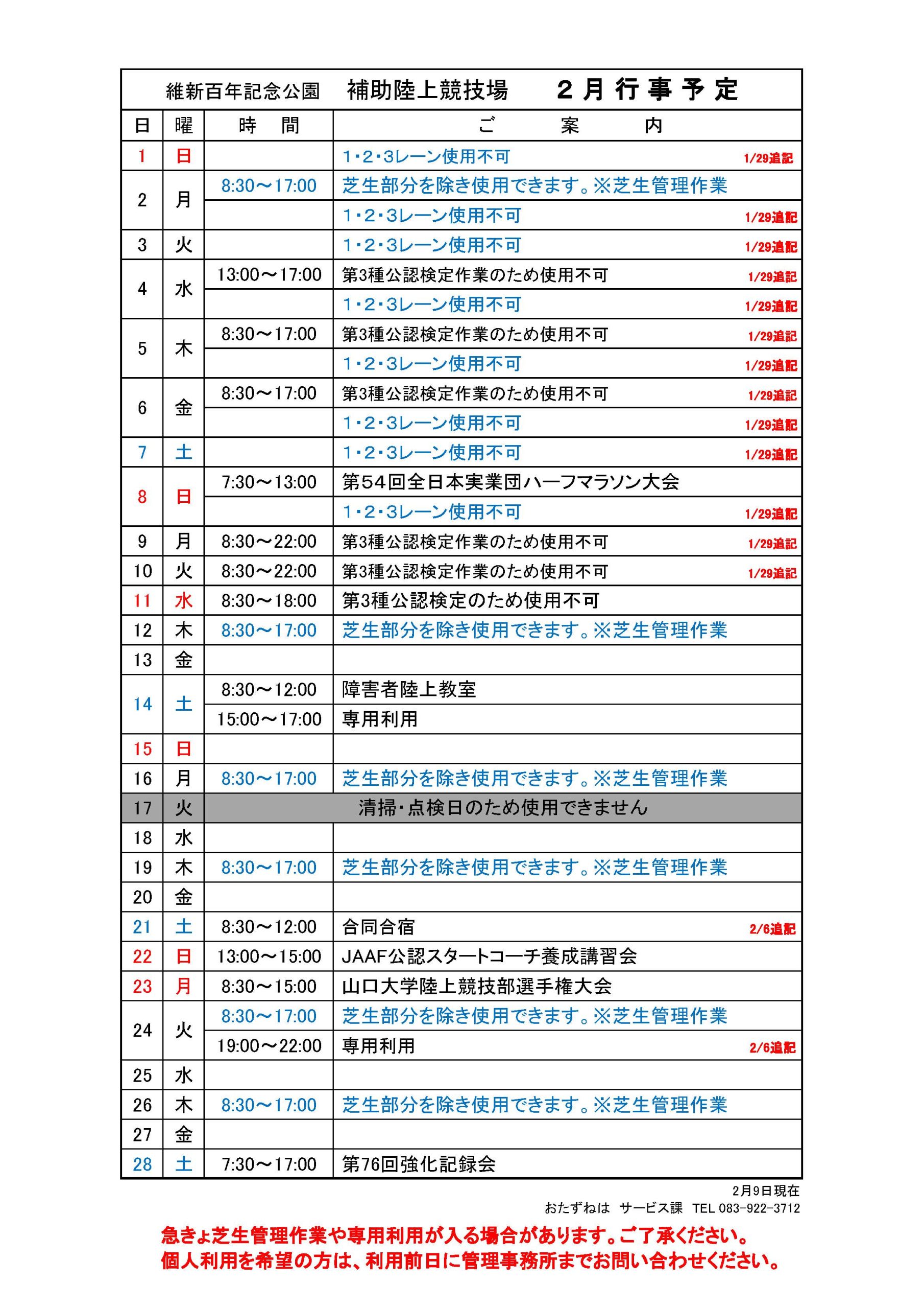 2026年2月9日 2026年2月9日 ishin_park お知らせ 補助陸上競技場利用予定について 大会行事等の専用利用が入っていない場合に、個人利用が可能となります。急きょ芝生管理作業や専用利用が入る場合があります。ご了承ください。個人利用をご希望の方は、利用前日に管理事務所までお問い合わせください。