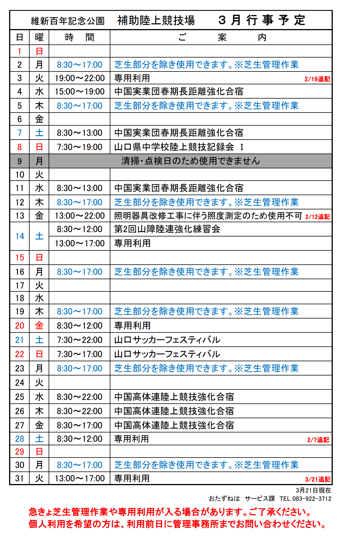 2026年3月23日 2026年3月23日 ishin_park お知らせ 補助陸上競技場利用予定について 大会行事等の専用利用が入っていない場合に、個人利用が可能となります。急きょ芝生管理作業や専用利用が入る場合があります。ご了承ください。個人利用をご希望の方は、利用前日に管理事務所までお問い合わせください。