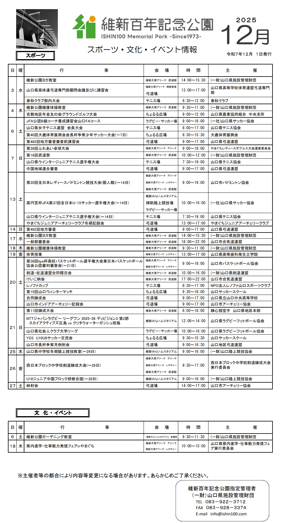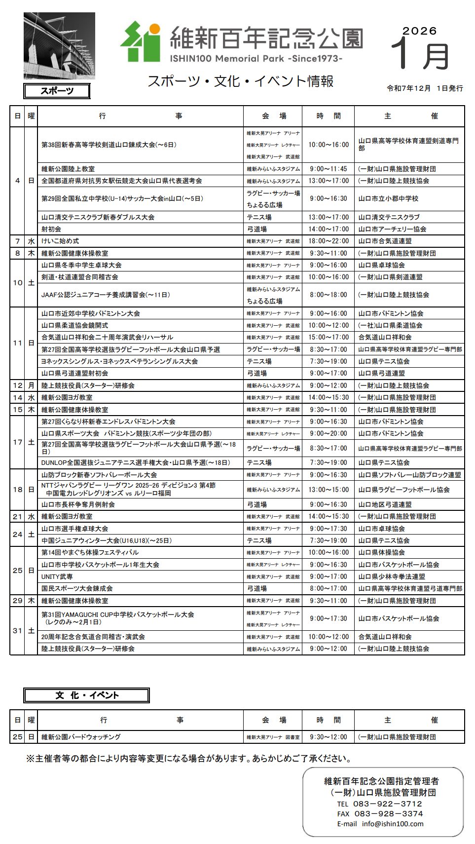 令和7年度 主要行事予定(令和7年10月1日現在) 4月の行事予定 5月の行事予定 6月の行事予定 7月の行事予定 8月の行事予定 9月の行事予定 10月の行事予定 11月の行事予定 12月の行事予定 1月の行事予定 2月の行事予定 3月の行事予定 12月の行事予定 ※クリックすると印刷用PDFファイルが開きます。 1月の行事予定 ※クリックすると印刷用PDFファイルが開きます。